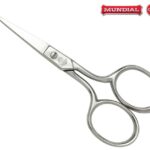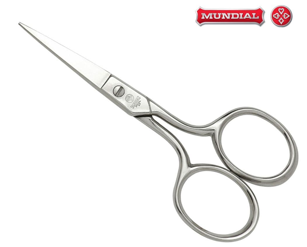 Tijera para bordar o trabajos finos, recta Mundial 426.4 de 10 cm. con hojas de acero carbono niqueladas.